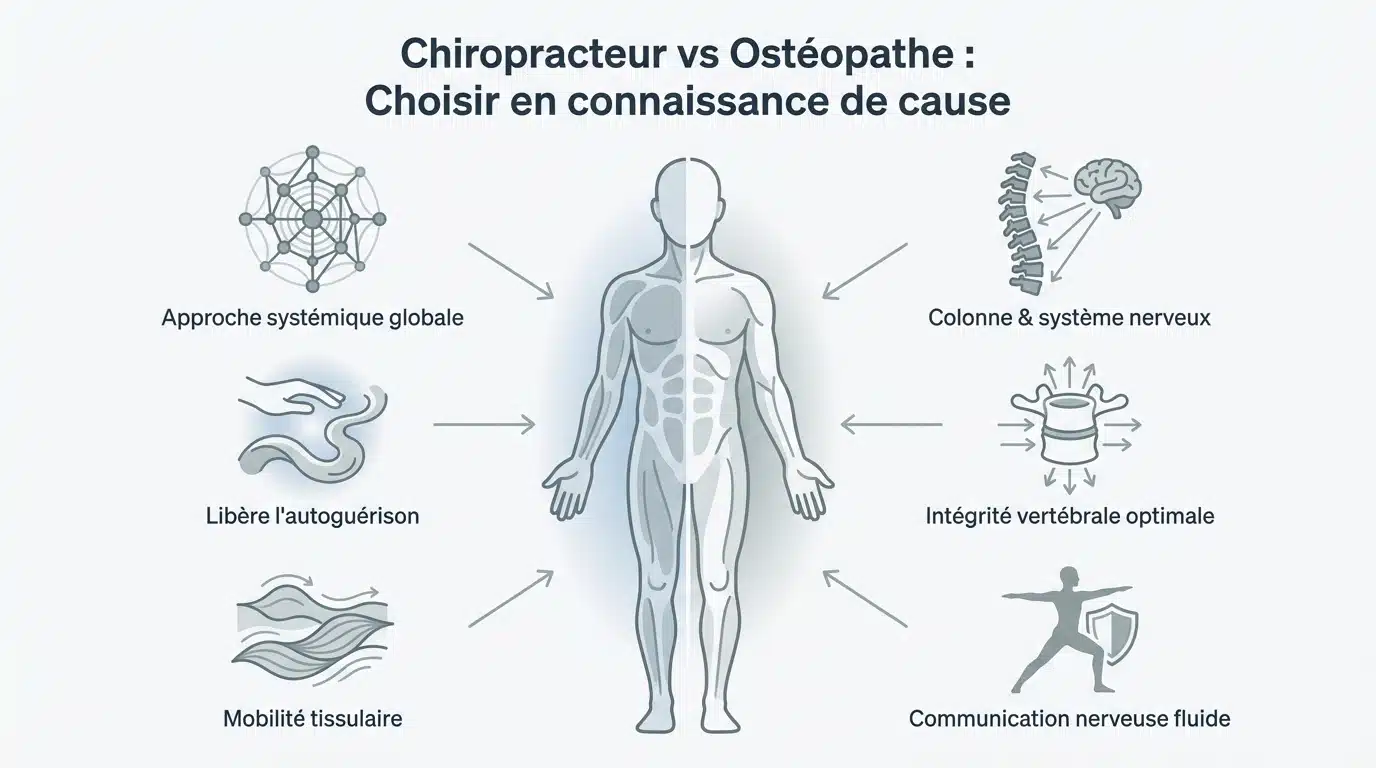 L’essentiel à retenir : ostéopathe ou chiropracteur ? L’ostéopathe privilégie une approche globale et manuelle de l’ensemble du corps, tandis que le chiropracteur se focalise sur la colonne vertébrale et le système nerveux avec l’aide d’outils de précision. Ce choix permet de cibler soit des troubles fonctionnels variés, soit des douleurs nerveuses spécifiques comme la sciatique. Un cursus rigoureux de 5 ans garantit la sécurité de ces soins.