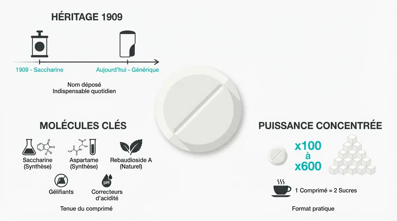 Ce qu’il faut retenir : la sucrette est un édulcorant intense, né en 1909, remplaçant le sucre sans apport calorique. Cette pastille au pouvoir sucrant stabilise la glycémie et facilite la gestion du poids sans sacrifier le plaisir gustatif. Un seul comprimé possède un pouvoir sucrant 100 à 600 fois supérieur au sucre traditionnel, offrant une solution nomade et efficace au quotidien.