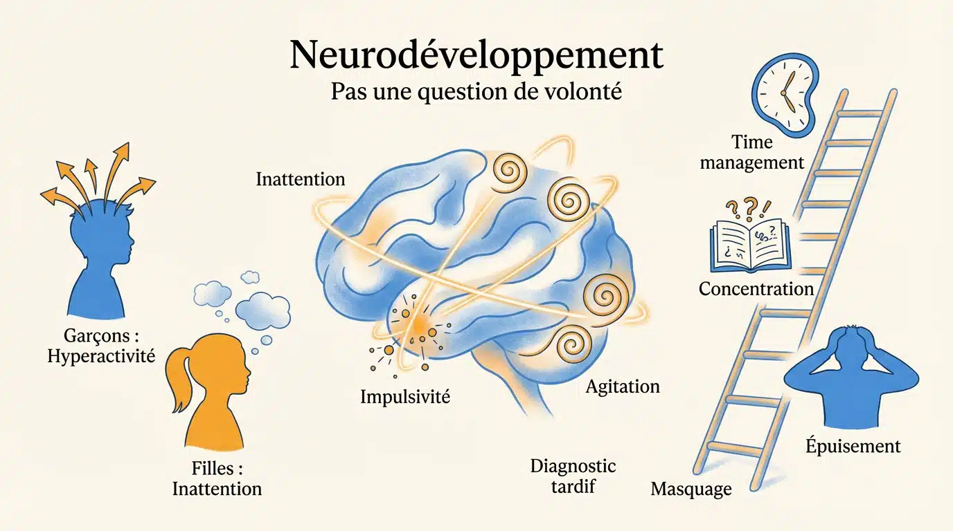 Le tdah est un trouble du neurodéveloppement présent dès la naissance. Ce n’est jamais une question de paresse. En fait, le cerveau traite les informations différemment. C’est une condition permanente qui influence chaque instant de la vie.